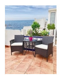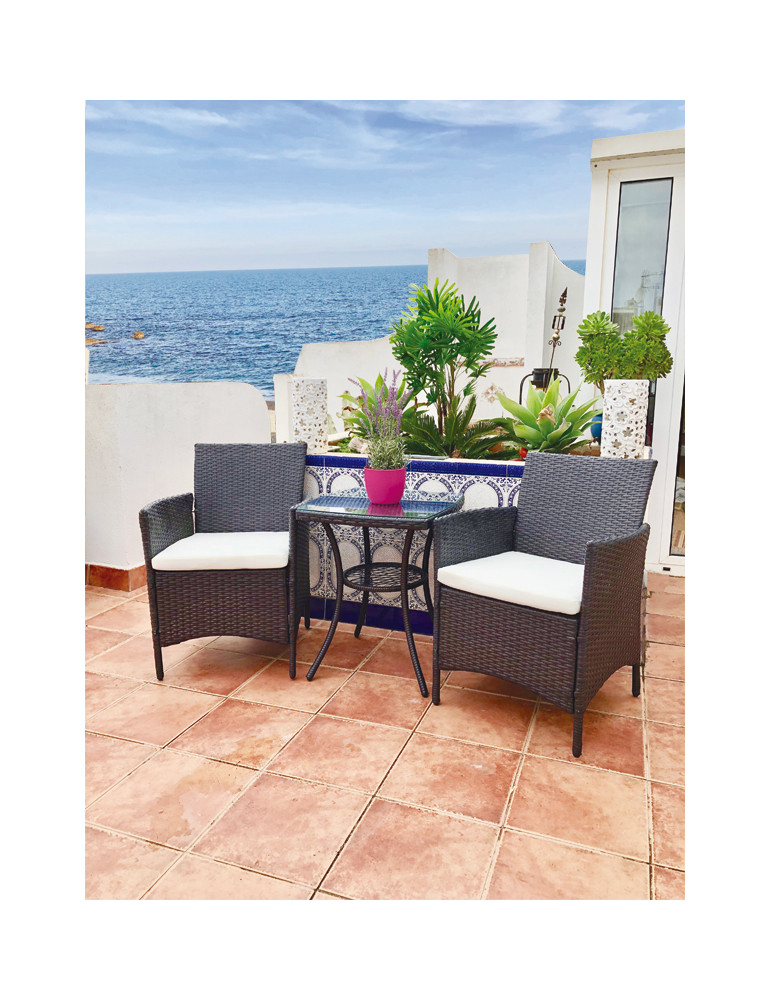 Diseño en ratán y acero negro. Incluye cojines y cristal templado en la mesa. Mesa: 53 x 53 x 66 cm y sillones: 59 x 60 x 82 cm.