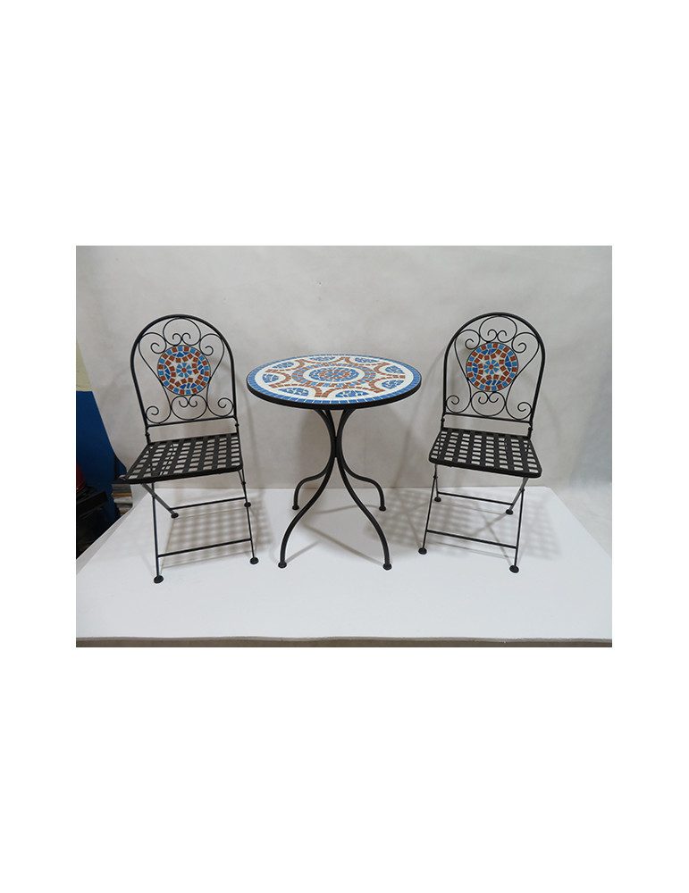 CONJUNTO RUANDA Fabricado en forja y cerámica. Sillas plegables: 4x37,5/52x91 CM Mesa:Ø61x91CM. Detalles en ceramica