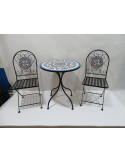 Fabricado en forja y cerámica. Sillas plegables: 4x37,5/52x91 CM Mesa:Ø61x91CM. Detalles en ceramica