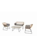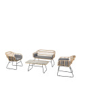 CONJUNTO ANGOLA Fabricado en acero y ratán sintético. Mesa de acero y cristal templado 100 x 54cm . Sillón: 66x45/67x81cm y sofá: 123x45/67x81cm. Incluye cojines de polyester.