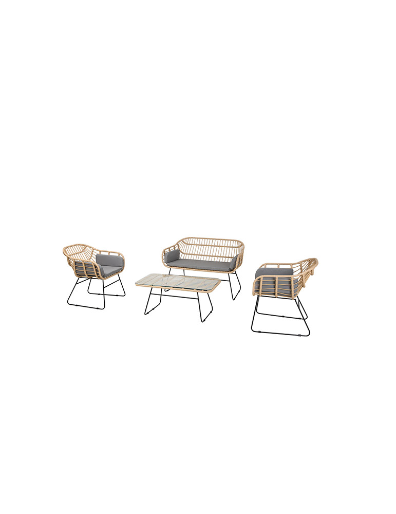 Fabricado en acero y ratán sintético. Mesa de acero y cristal templado 100 x 54cm . Sillón: 66x45/67x81cm y sofá: 123x45/67x81cm. Incluye cojines de polyester.