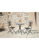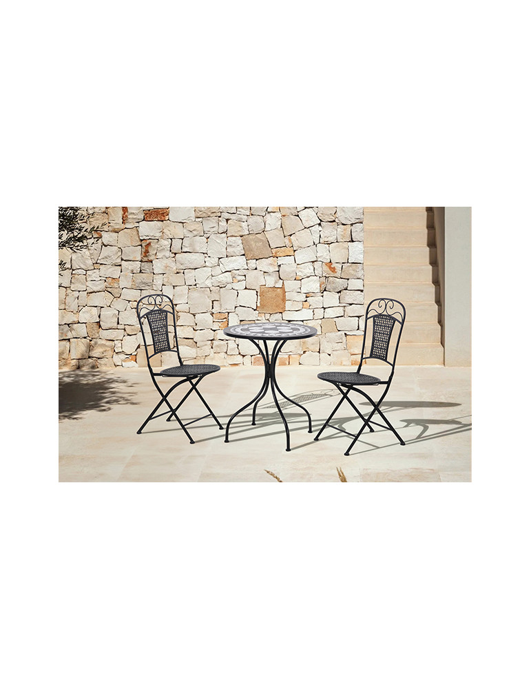 Fabricado en forja y cerámica. Sillas plegables: 39X69X92 CM Mesa:Ø60x71CM. Detalles en ceramica