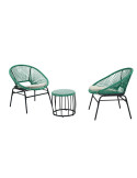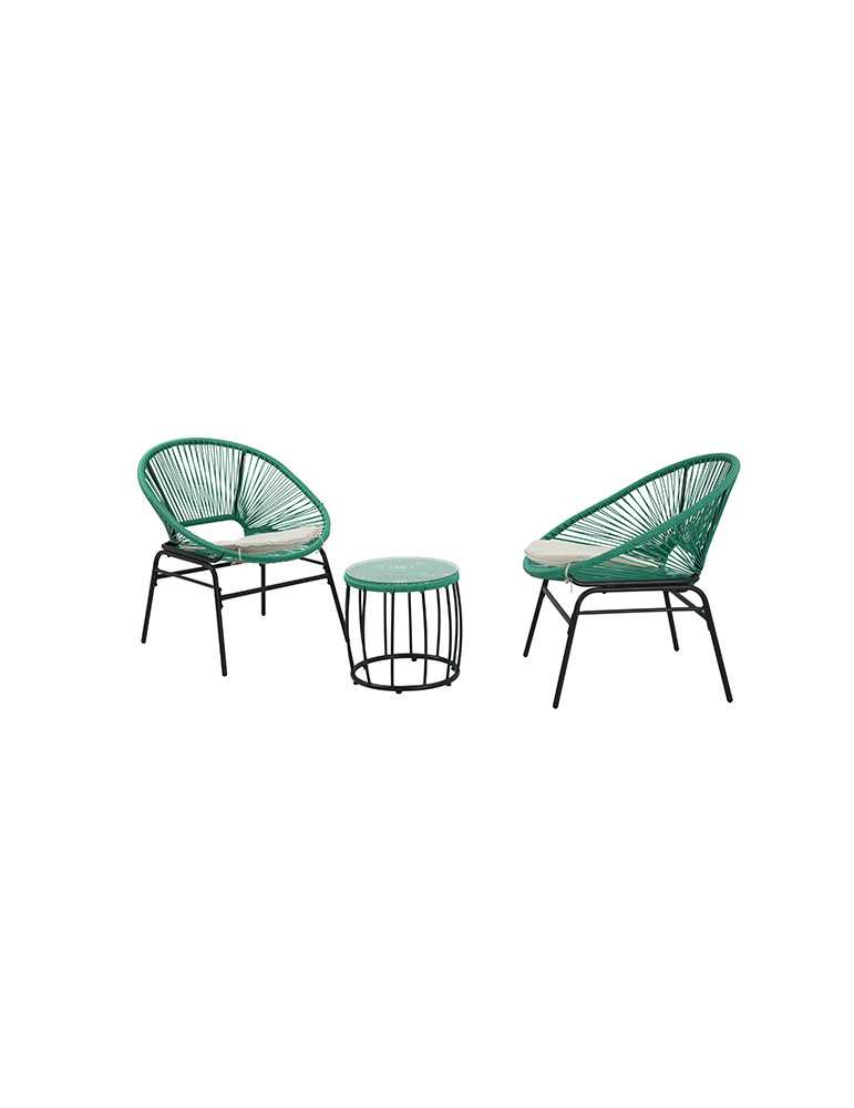 Mesa y dos sillones en acero y ratán sintético. Incluye cojines en beige. Mesa diam. 40x40cm y sillones 67x73,5x76cm