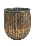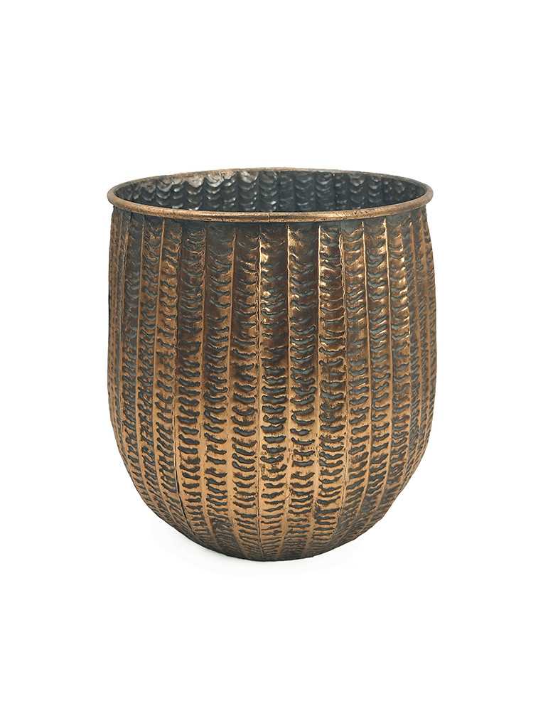 Maceta decorativa de latón con acabado envejecido y diseño texturizado en relieve. Su forma redondeada y detalles verticales le aportan un estilo artesanal y elegante. Ideal para interiores y exteriores. Medidas: Ø36x37,5h