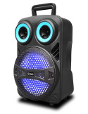 Bluetooth, 25 W, altavoz con efectos iluminados de 8”, radio FM, puertos: USB, micro SD, auxilar, control remoto, batería 1.200 mAh, incluye micrófono inalámbrico.