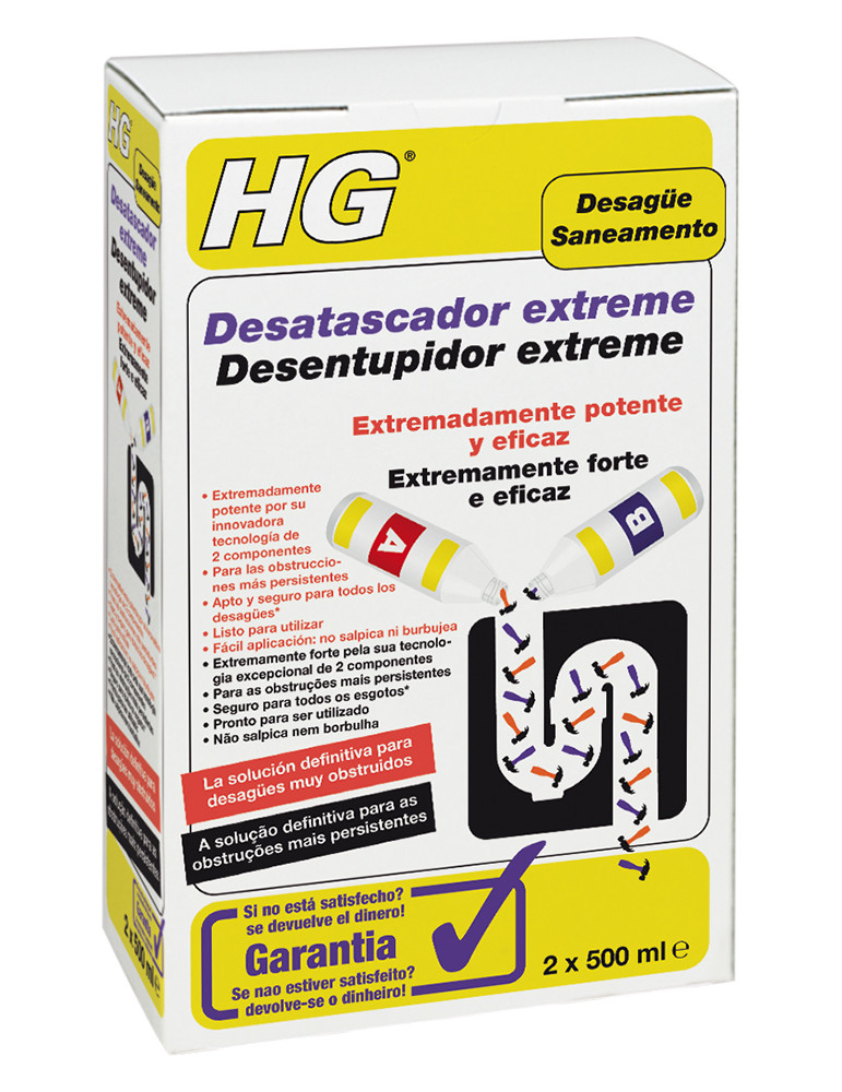Extremadamente potente por su innovadora tecnología de dos componentes. Para las obstrucciones más persistentes. Apto y seguro para todo tipo de desagües. Listo para usar. Fácil aplicación. Válido para cocinas y baños. No salpica ni burbujea. 2X 0,5