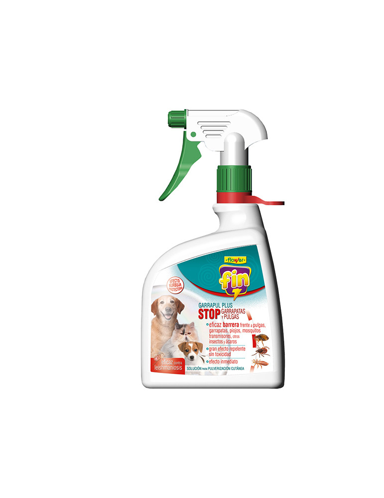 FIN GARRAPUL PLUS Crea una capa protectora sobre la piel del animal. Se aplica mediante pulverización sobre la piel. Previene picaduras de mosquitos, tábanos, simúlidos, moscas, pulgas, ácaros y garrapatas. 1 l.